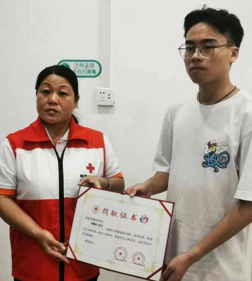 ▲何繼東兒子何貴蔚(右1)從百色市紅十字會工作人員手上接過捐獻(xiàn)證書