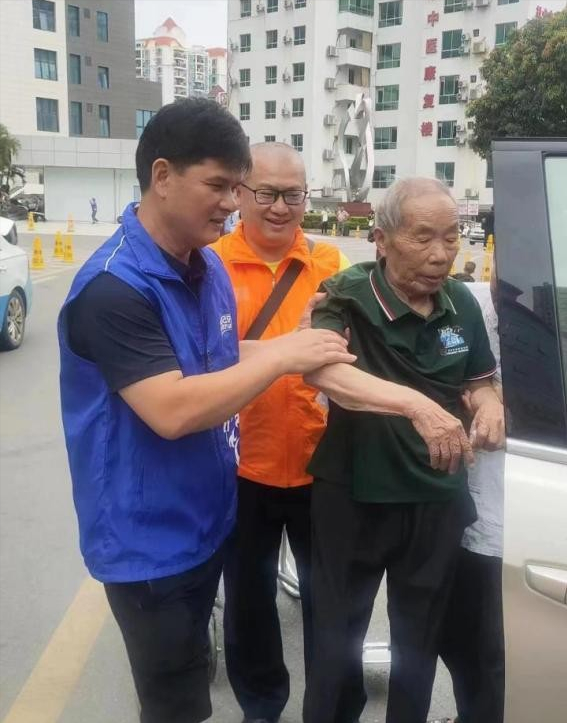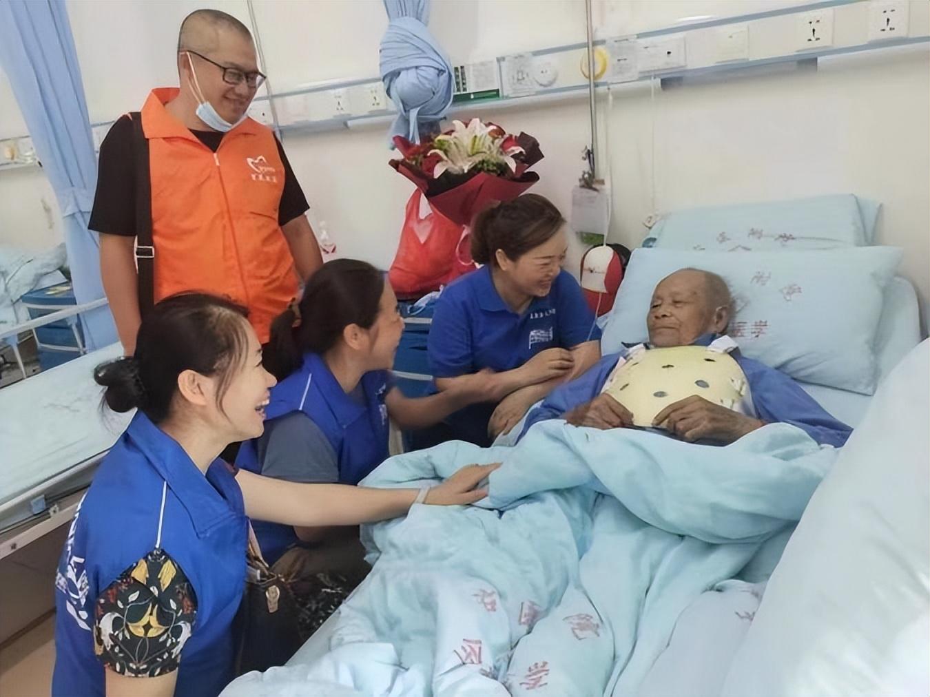 ▲何繼東(身穿橙色馬甲)與義工志愿者到醫(yī)院探望摔傷的抗戰(zhàn)老兵