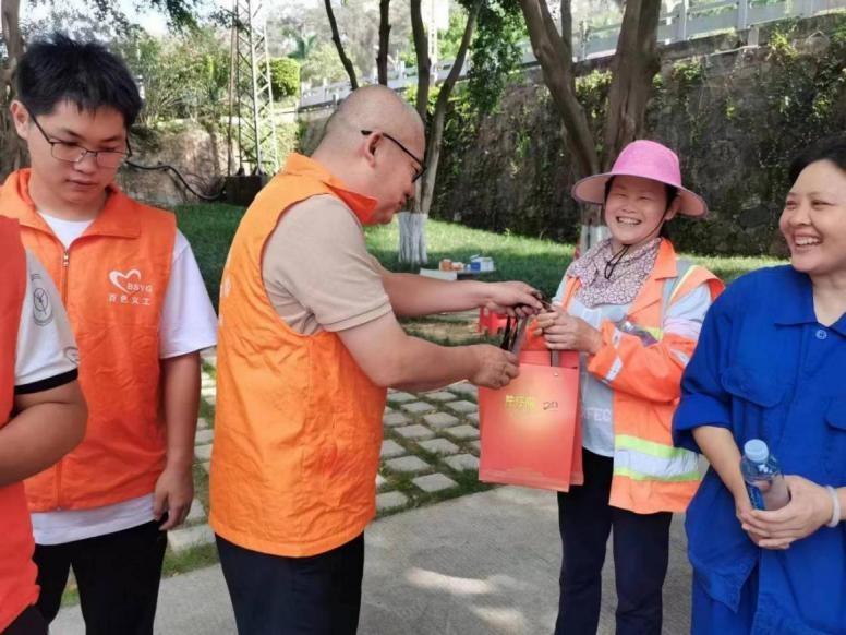 6月14日,何繼東帶領(lǐng)志愿者開展慰問城市園林工人活動;