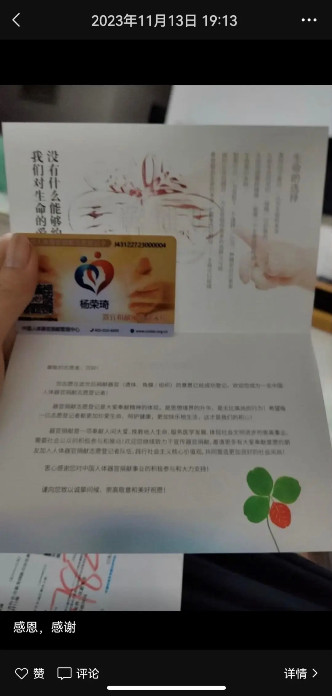 2023年11月13日晚上7點13分,懷化市新晃縣27歲的在讀研究生楊榮琦,發(fā)出了他人生的最后一條朋友圈“感恩、感謝”,配圖是他申請的“中國人體器官捐獻志愿登記卡”。